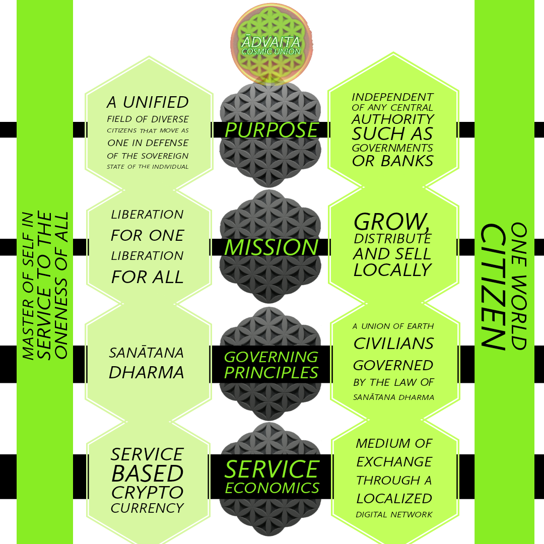 Ādvaita Cosmic Union is at best described as my ‘fit of audacity’. The audacity to call upon the shared desire for betterment of our lives, to satisfy our inherent will to expand the magnitude of our being in space, and to perpetuate ourselves in time. It is the courageous act of the ultimate idealist to envision an economy based on the ‘4th Way’ as described by Gurdjieff – the Way of Service and not that of oppression. It is a concept to unify the power of the Global Human Psyche with the power of Diverse Individual bodies. Power that is no longer imposed on us, but a power that is reclaimed by we the people, on account of remembering the Divine Identity of our Being.