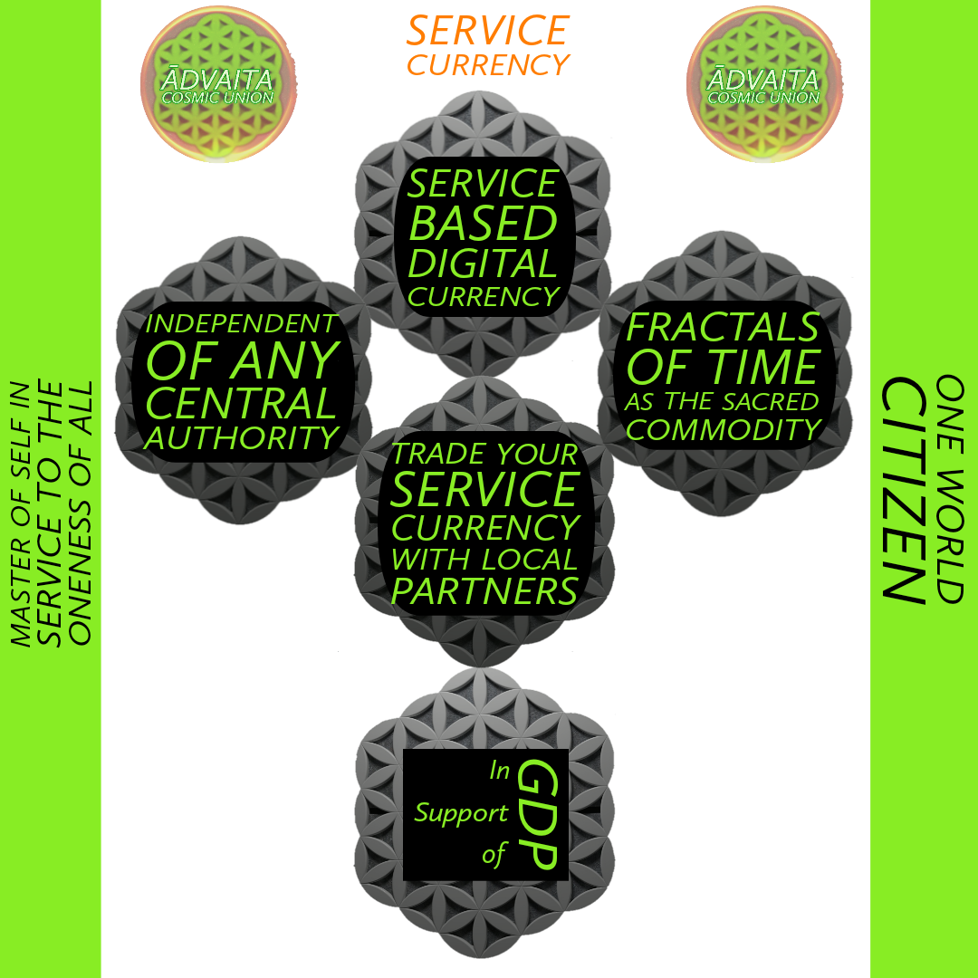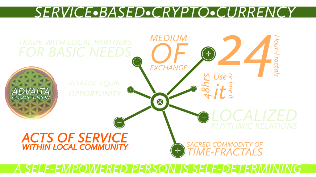 The Medium of Exchange is the Sacred Commodity of Time. Each Individual on this Globe receives an equal amount of Time-Fractals each day and which returns to naught at the end of that same day. Tomorrow will again offer the same equality and relative opportunity to the Individual, allowing for gradual uplift and progress of mankind.