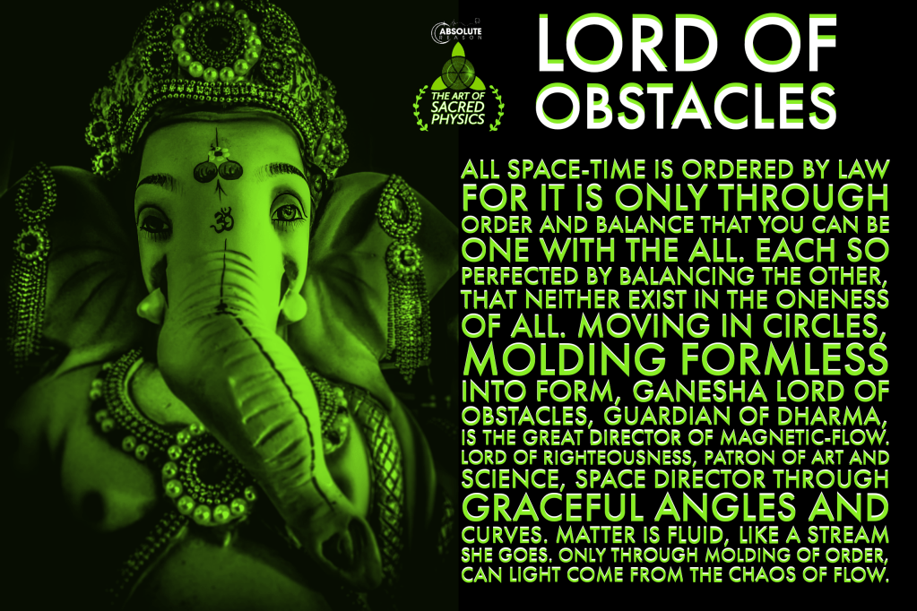 All space-time is ordered by law for it is only through order and balance that you can be one with the All. Each so perfected by balancing the other, that neither exist in the oneness of all. Moving in circles, molding Formless into form, Ganesha Lord of Obstacles and Guardian of Dharma, is the great director of magnetic-flow. Lord of Righteousness, Patron of Art and Science, space director through graceful angles and curves. Matter is fluid, like a stream she goes. Only through molding of order, can light come from the chaos of flow.